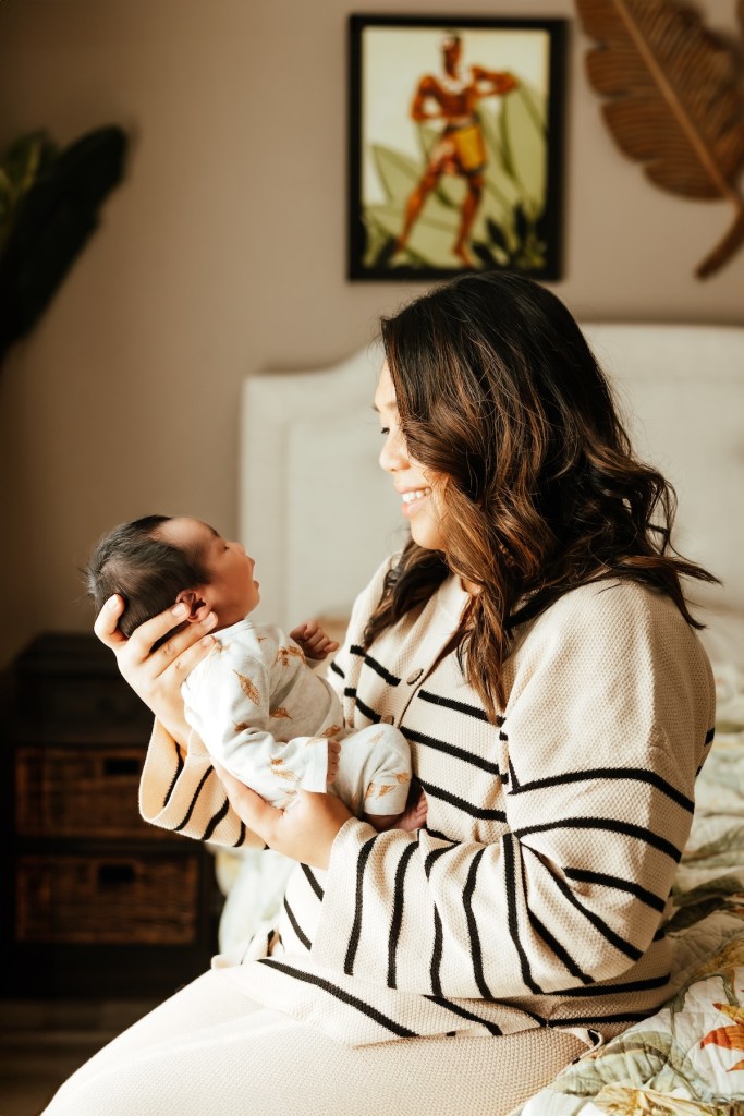 I typically schedule these sessions in the late morning and sometimes at midday. Unlike outdoor sessions that I recommend scheduling for golden hour, indoor sessions benefit from shooting during the brightest part of the day. I also try to avoid toddler’s nap time and baby’s witching hour. Taking all those factors into account usually lead us to schedule newborn sessions in the late morning.