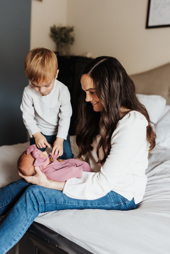 Often an older sibling can be uninterested in the baby and it can be difficult to get them to interact. To encourage a toddler to engage with baby I have had success with hiding gummy snacks or puffs in baby’s swaddle (that is how we got big brother loving on baby sister in these photos). But sometimes it is as simple as asking them to smell baby’s head or feet, point out baby’s features like their nose, eyes or fingers.